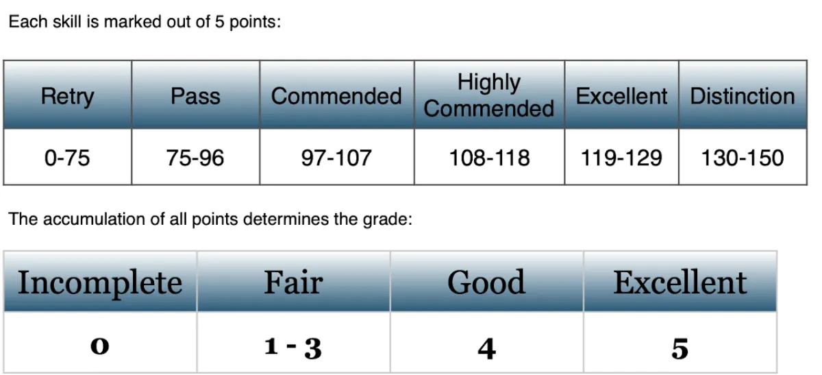 Each skill, bonus skill, exam etiquette and presentation are marked out of 5. The accumulation of all points determines the grade. The exam will be graded as 'Retry', 'Pass', 'Fair', 'Good', 'Excellent' or 'Superior'. Successful students will receive a certificate to commemorate their achievements. Students who receive the grade 'Superior' will also receive a custom Acrobatic Arts medal. All students will receive a report card complementing areas of excellence and suggesting areas for improvement. All exams are marked against the "standard" for the level and skill being performed. Acrobatic Arts Adjudicators receive extensive training and are required to attend uImagepdate courses to ensure consistency throughout the program. The adjudicator's mark is final.